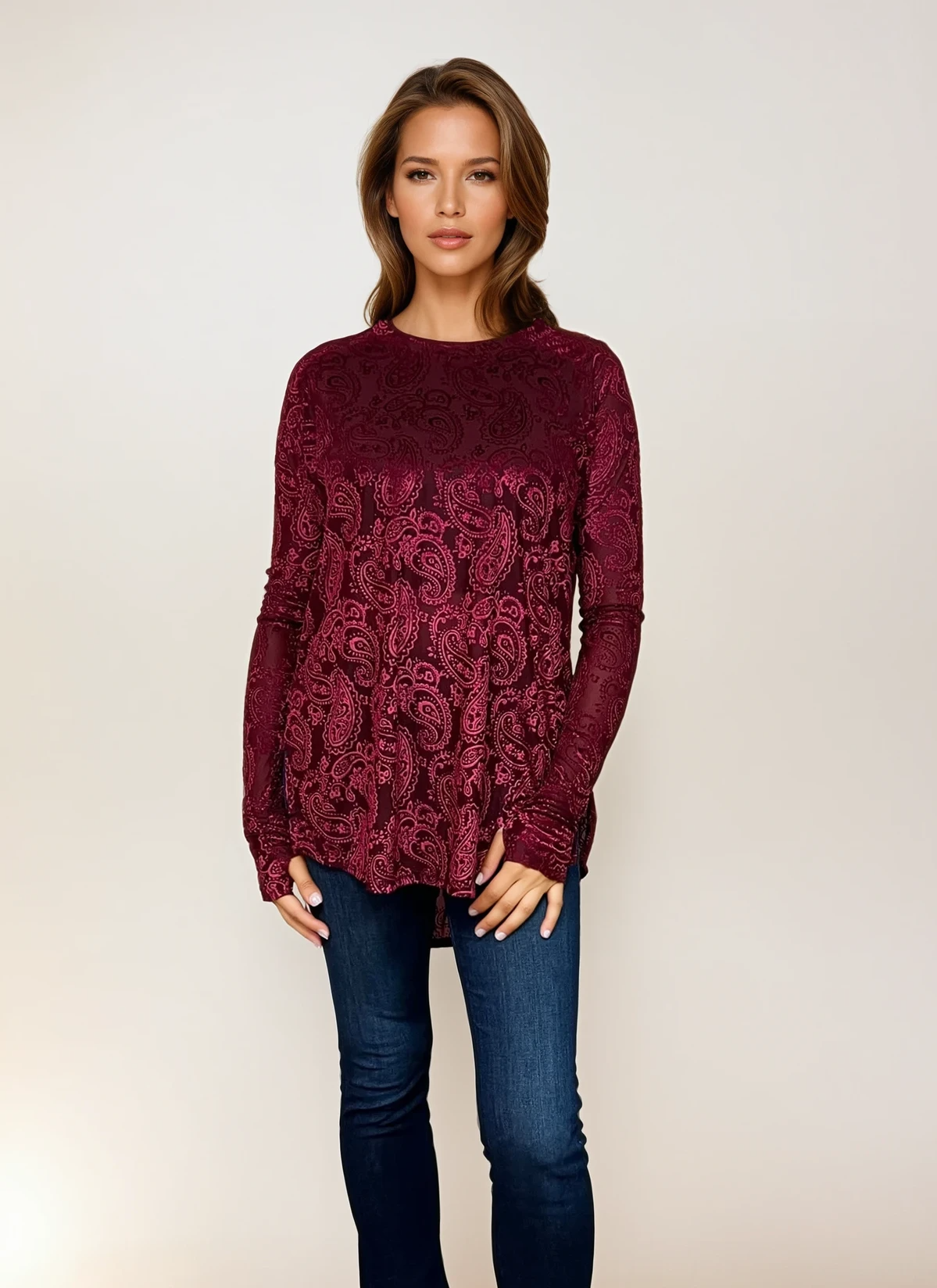 Textured, sophisticated, and endlessly versatile—the Burnout Edition is a statement piece with a subtle edge. The burnout fabric adds depth and dimension, while the tunic-length design, back pleats, and side slits create a flattering silhouette. Thumbholes offer a cozy, polished touch, making this top as practical as it is stylish.