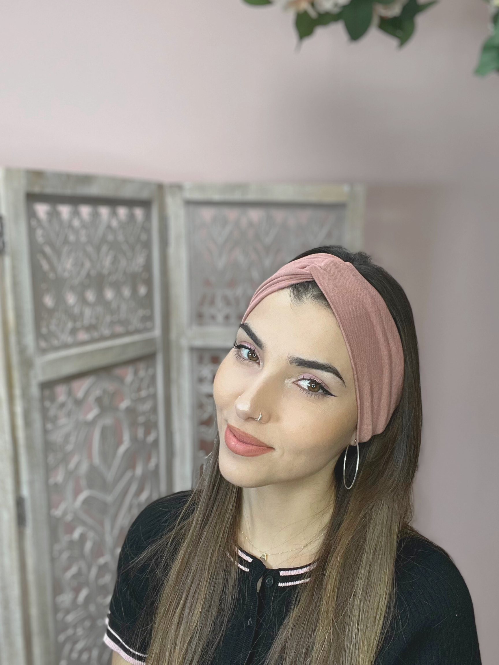 Twist Tie (Pink in picture) is sewn and has a knot on one side, the Farrah (red in picture) is one long headband.