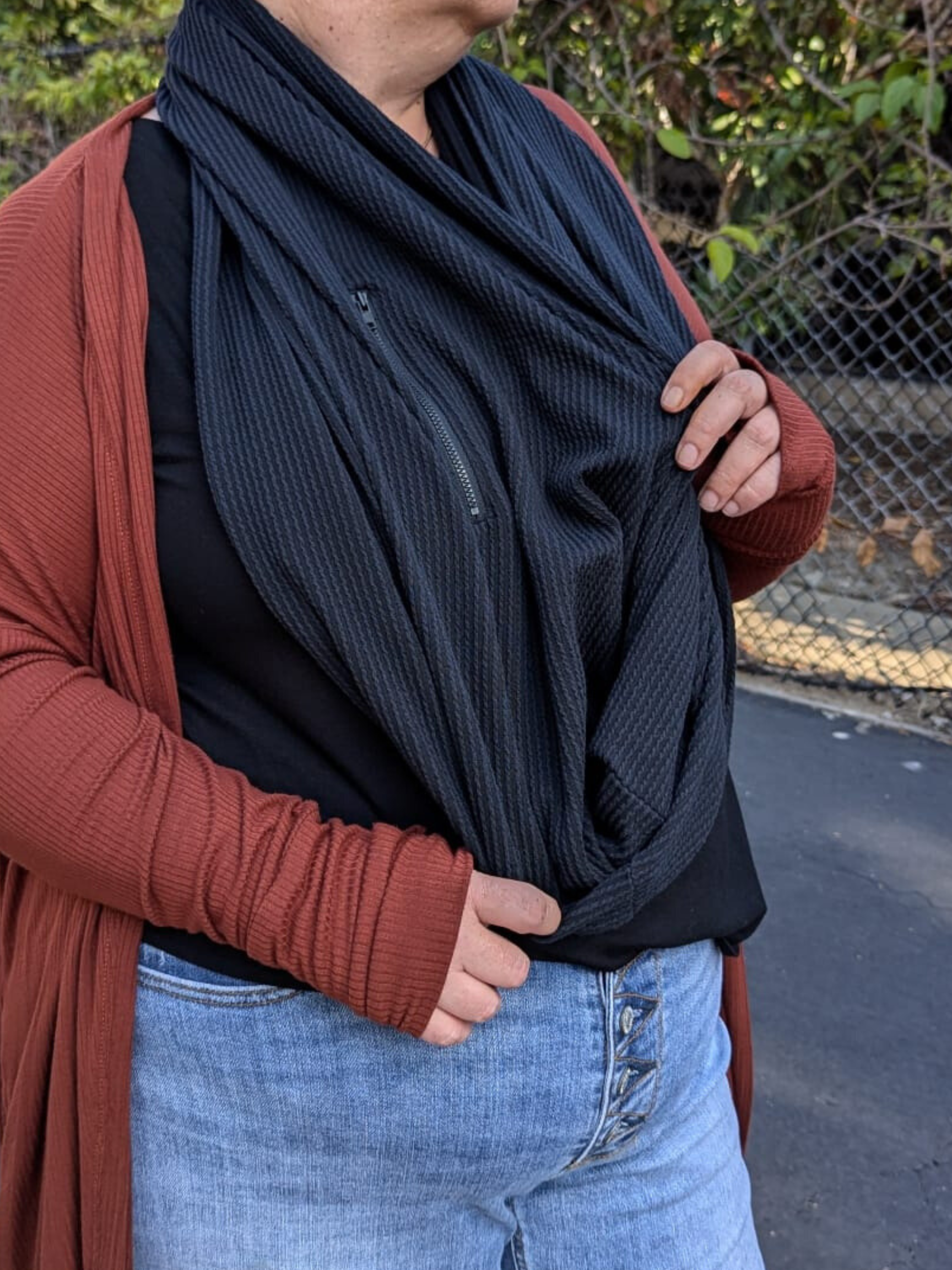 What sets our scarf apart is the innovative zippered pocket, a game-changer in fashion accessories. This discreet pocket is not only a stylish design element but also a practical solution to keep your hands free and belongings secure. Tired of juggling your keys, phone, or other small items? The Infinity Zipper Pocket Scarf has got you covered.