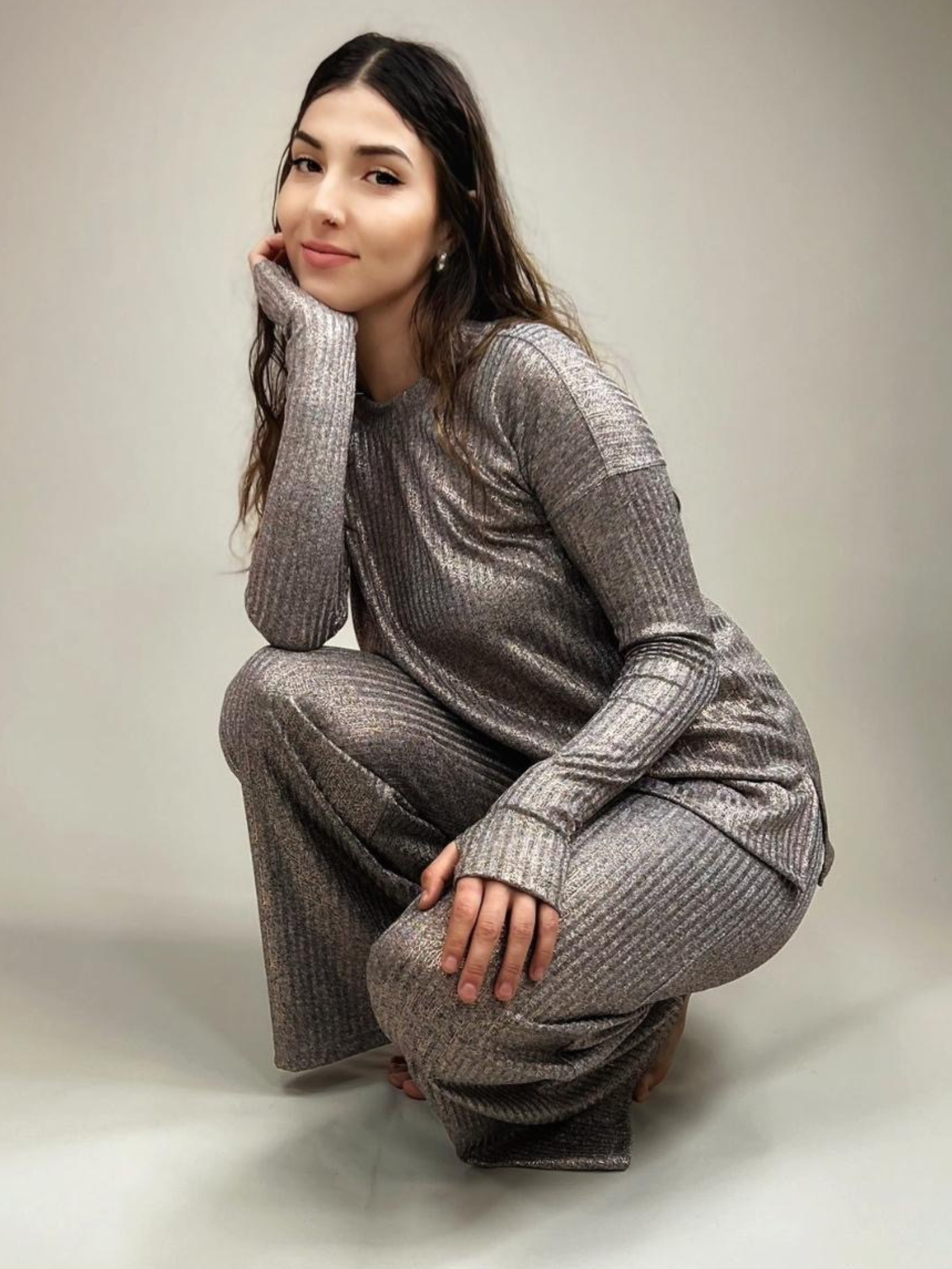 Elevate your lounging game with the Stardust Holiday Lounge Set. Crafted from a unique soft ribbed fabric with a stunning rose gold overlay, this set is as dazzling as it is comfortable—no itchy interiors here, just pure softness! The long-sleeve top pairs perfectly with wide-leg pants, making it the ultimate choice for cozy nights in or casual gatherings.