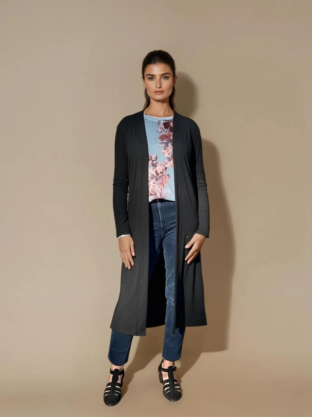 Designed with a graceful, straight silhouette that flatters every body, this duster adds an effortless touch of sophistication to any outfit. Made stretchy ribbed fabric, it’s perfect for layering over dresses, jeans, or even cozy loungewear. With full-length sleeves and ankle length, our Maxi Duster is the statement piece you’ll reach for time and time again.