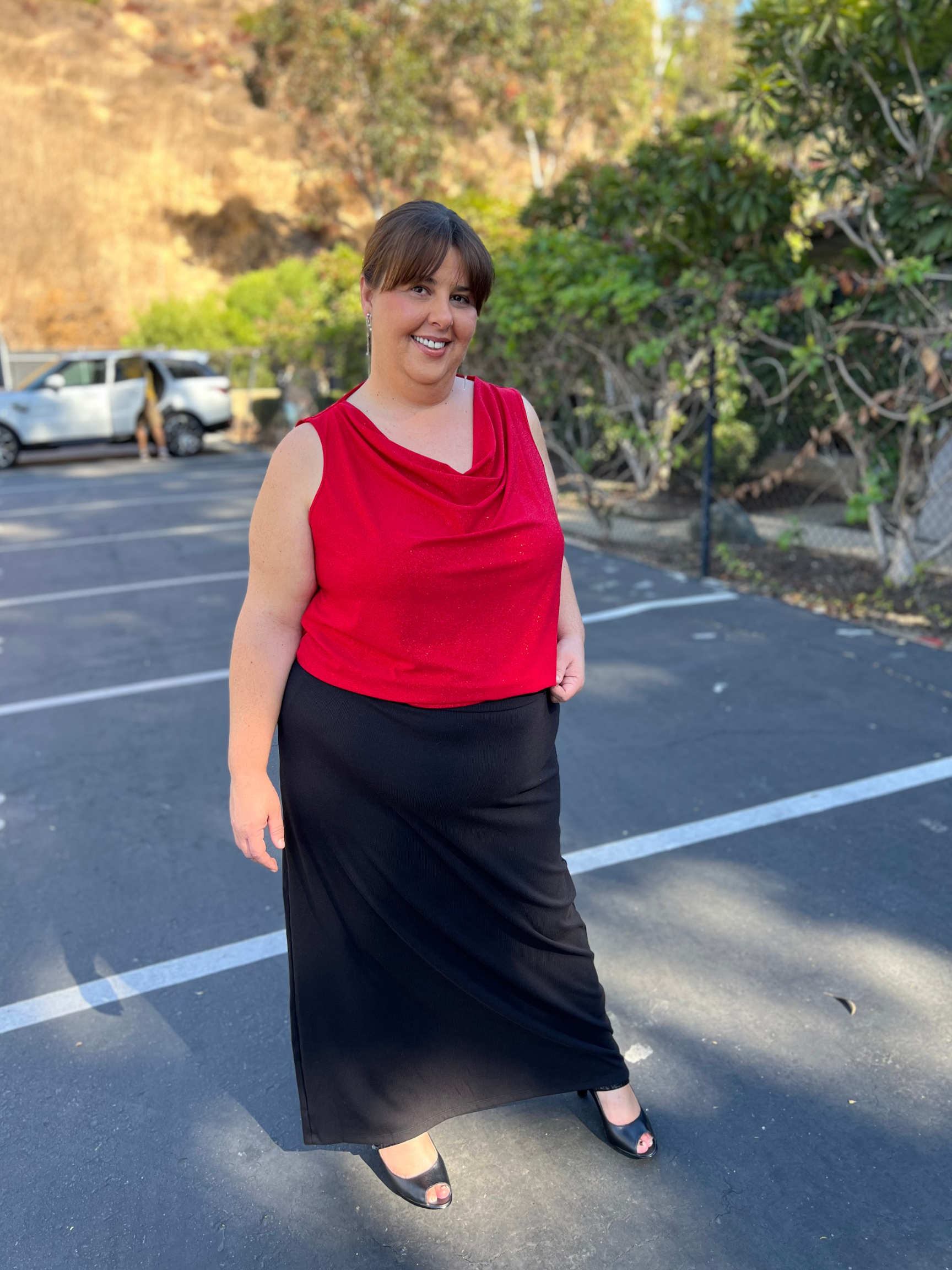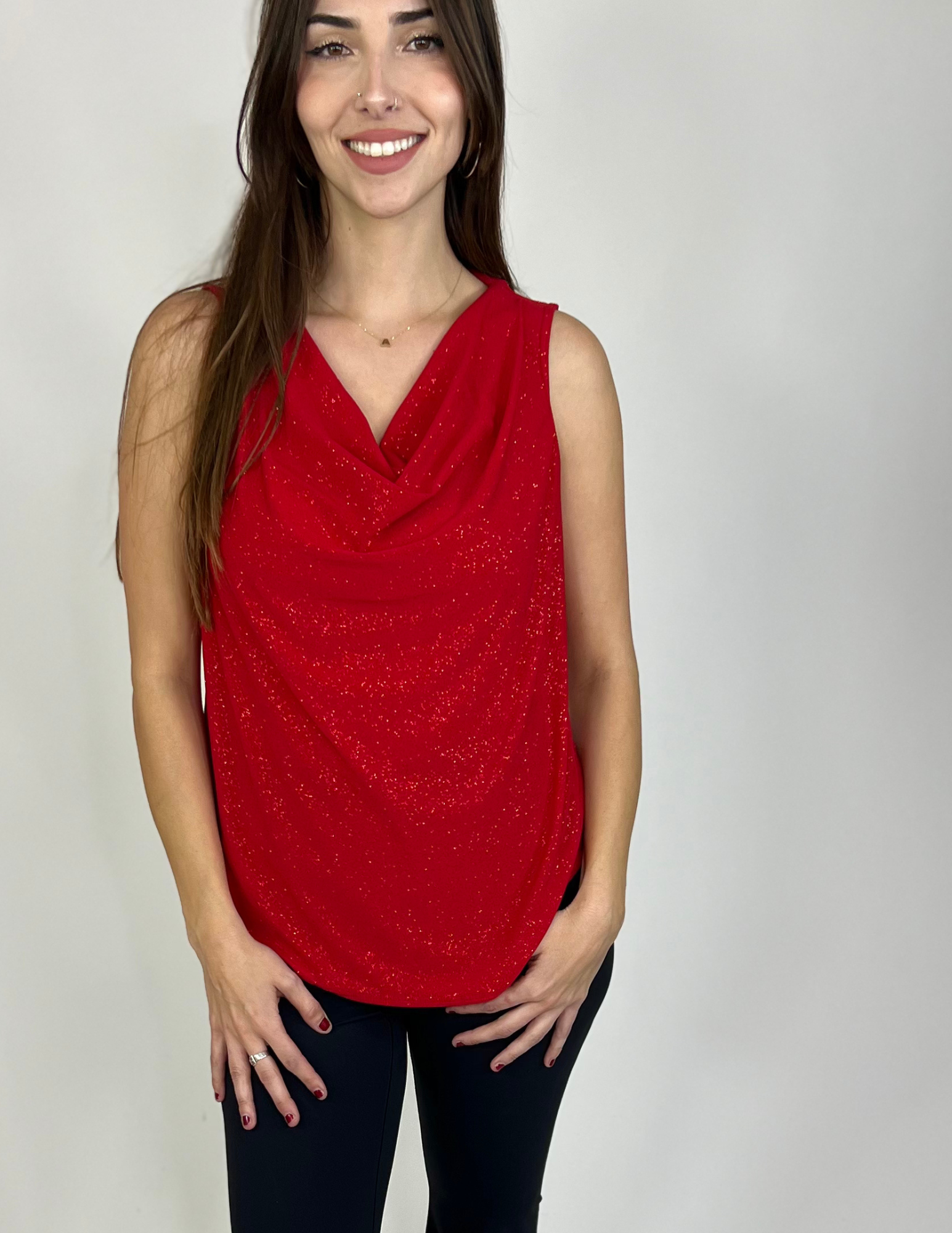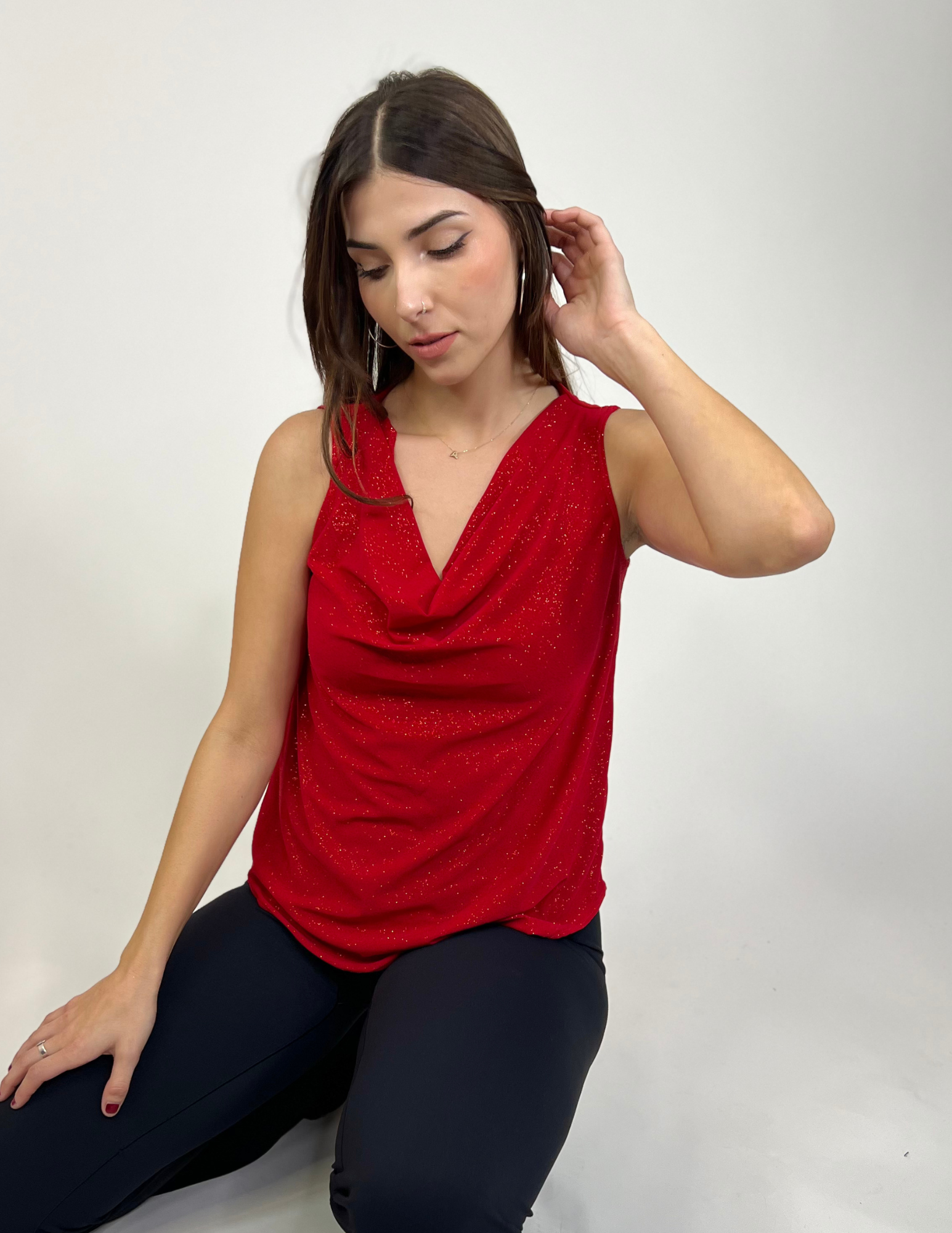 Step into the season with effortless elegance in the Nichole Tank. Featuring a sophisticated drapey neckline, this tank top is the perfect mix of understated glamour and modern style. Its fluid silhouette adds a touch of femininity, making it a standout piece for any holiday gathering.