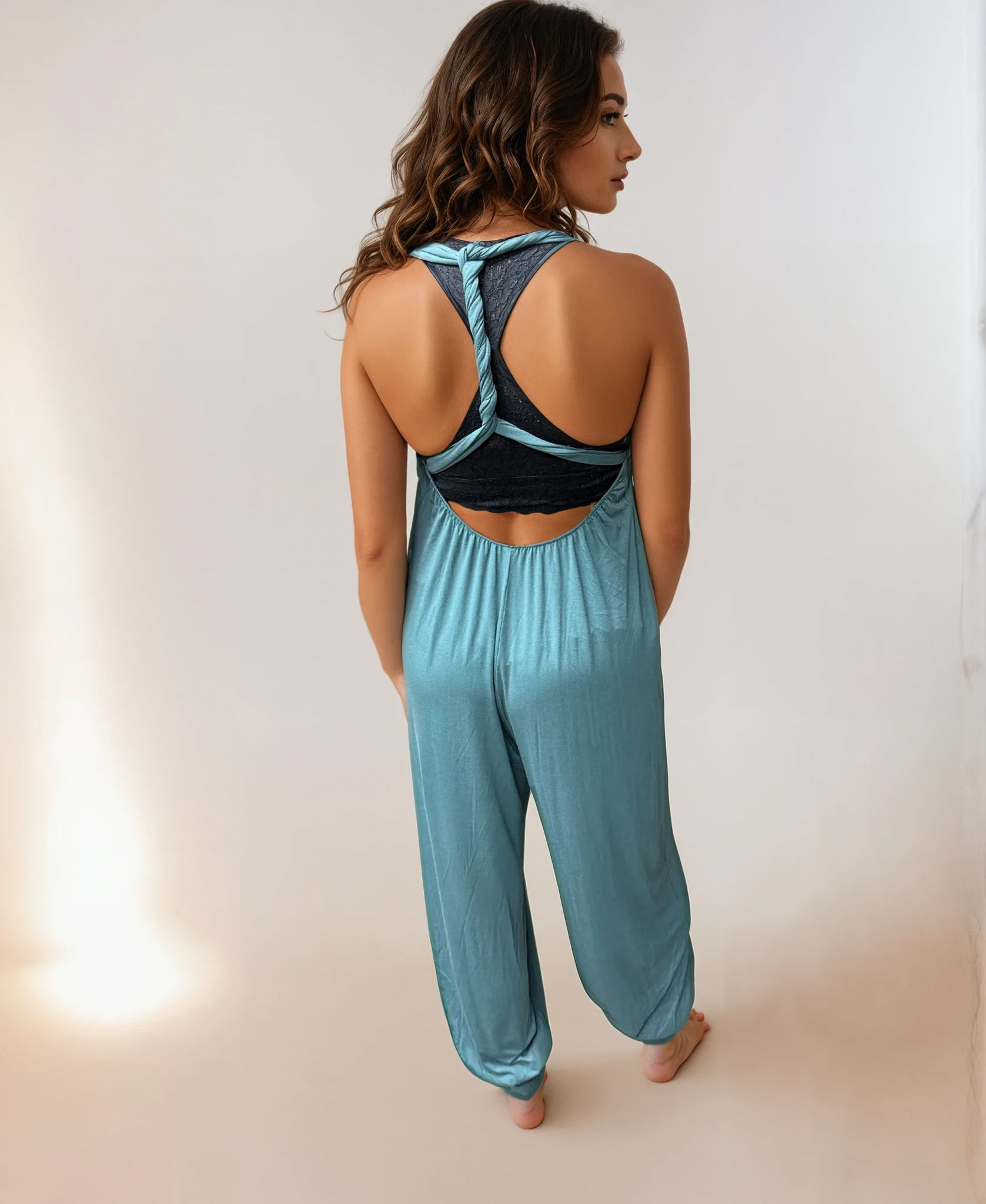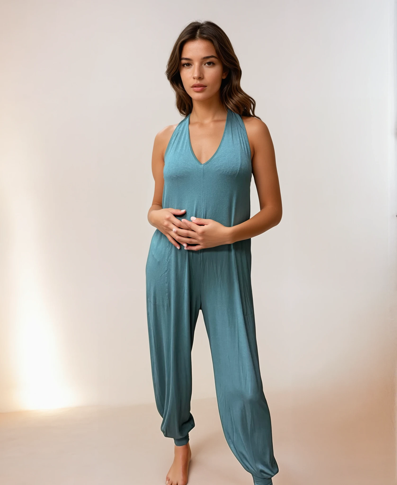 The Sunday Morning Jumper features cuffs at the legs which means you don't have to worry about length and seamless pockets and the halter style top so the ways to wear it are endless.