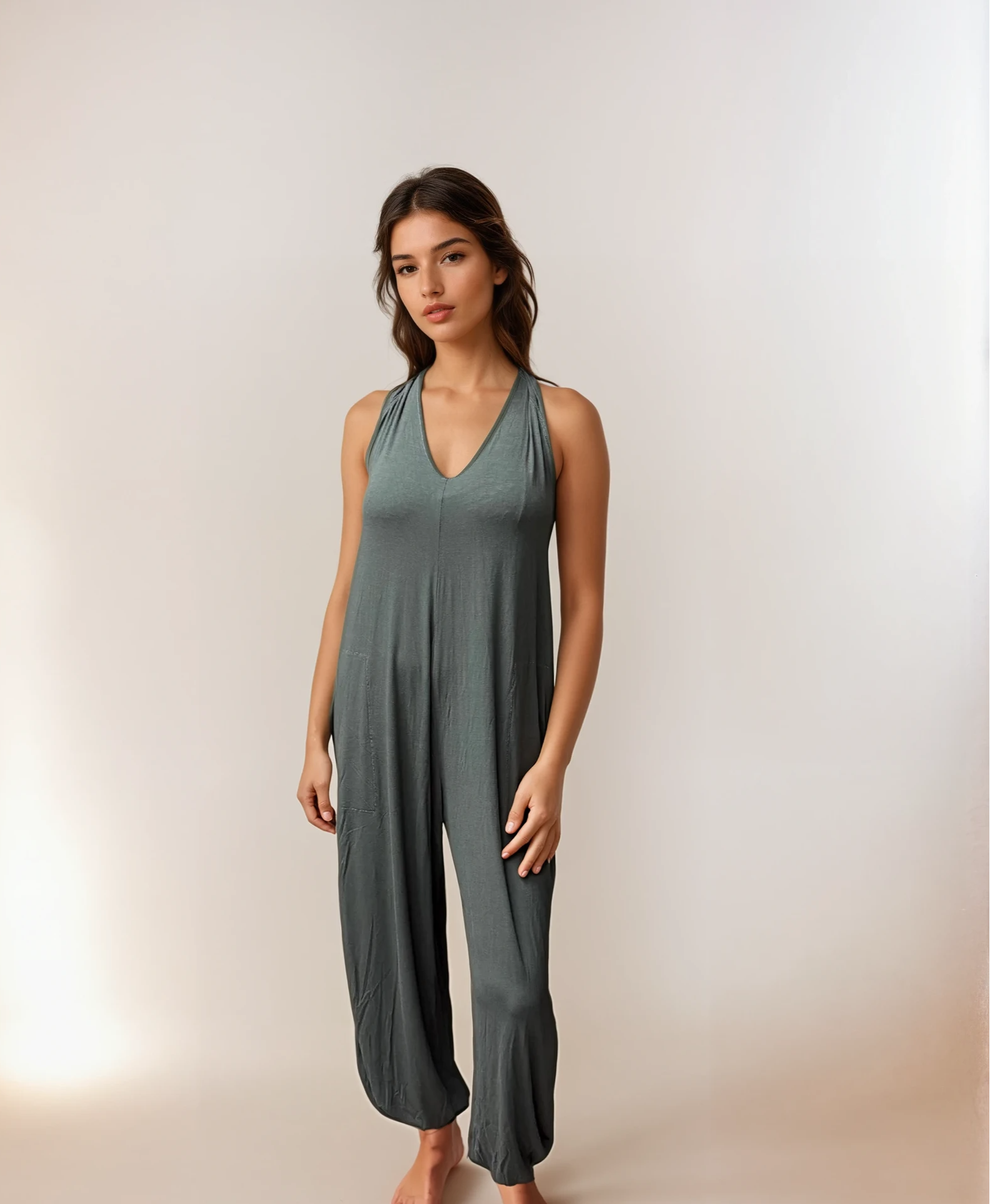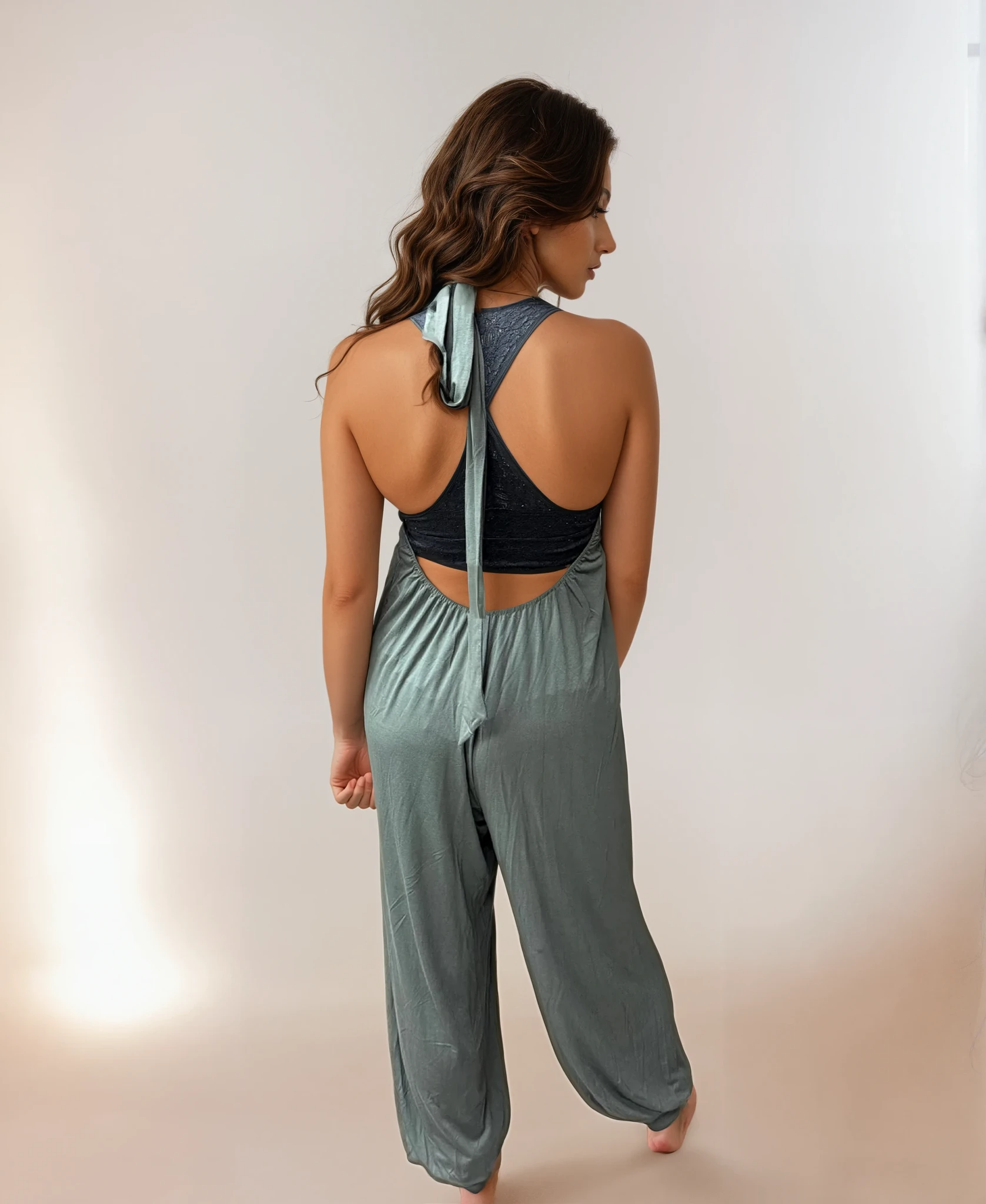 The Sunday Morning Jumper features cuffs at the legs which means you don't have to worry about length and seamless pockets and the halter style top so the ways to wear it are endless.