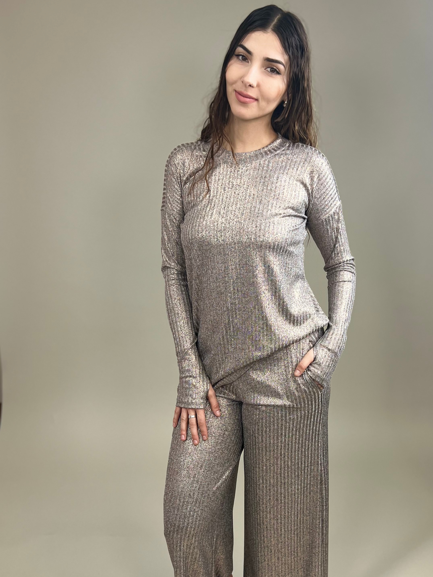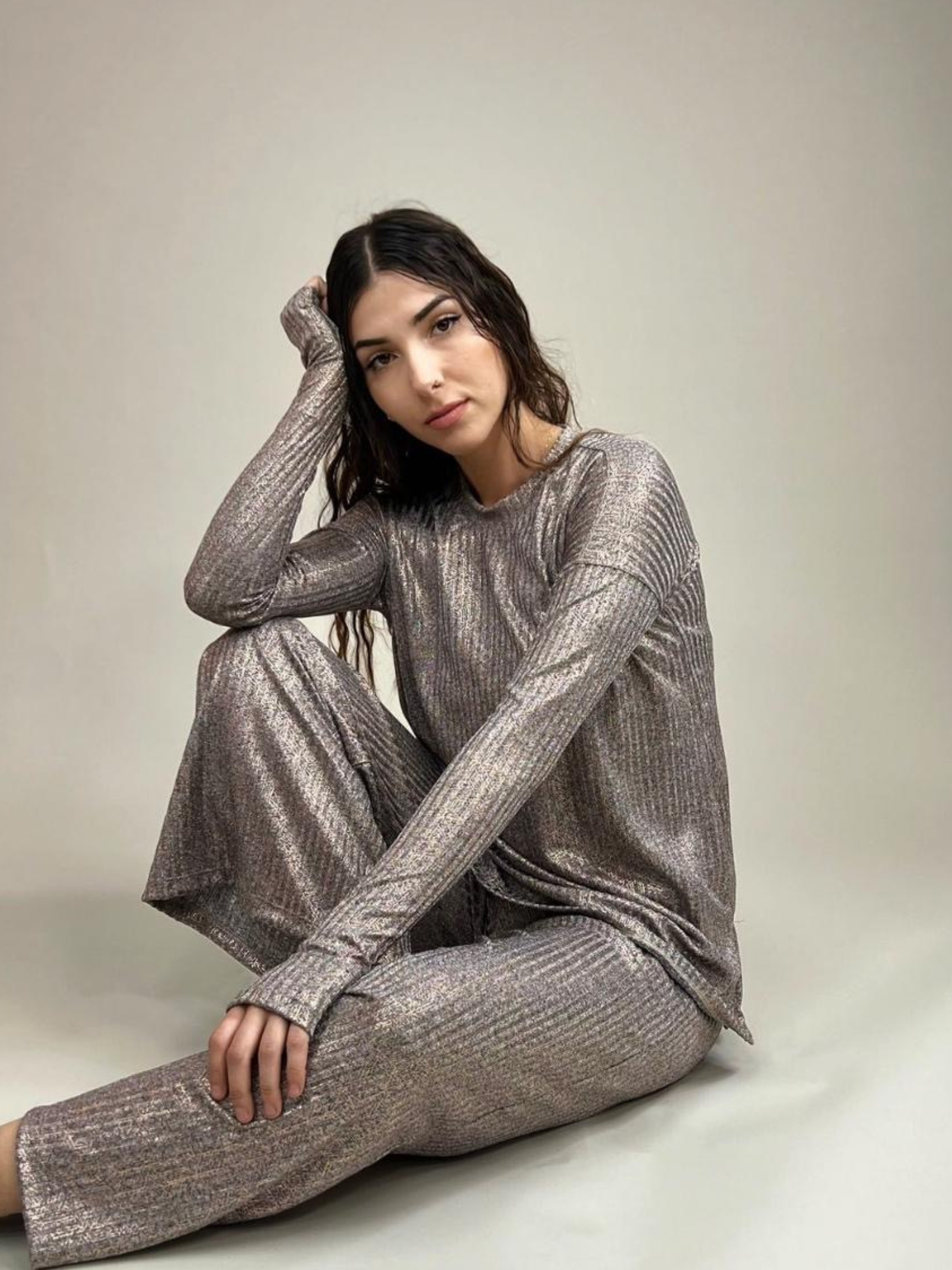 Elevate your lounging game with the Stardust Holiday Lounge Set. Crafted from a unique soft ribbed fabric with a stunning rose gold overlay, this set is as dazzling as it is comfortable—no itchy interiors here, just pure softness! The long-sleeve top pairs perfectly with wide-leg pants, making it the ultimate choice for cozy nights in or casual gatherings.